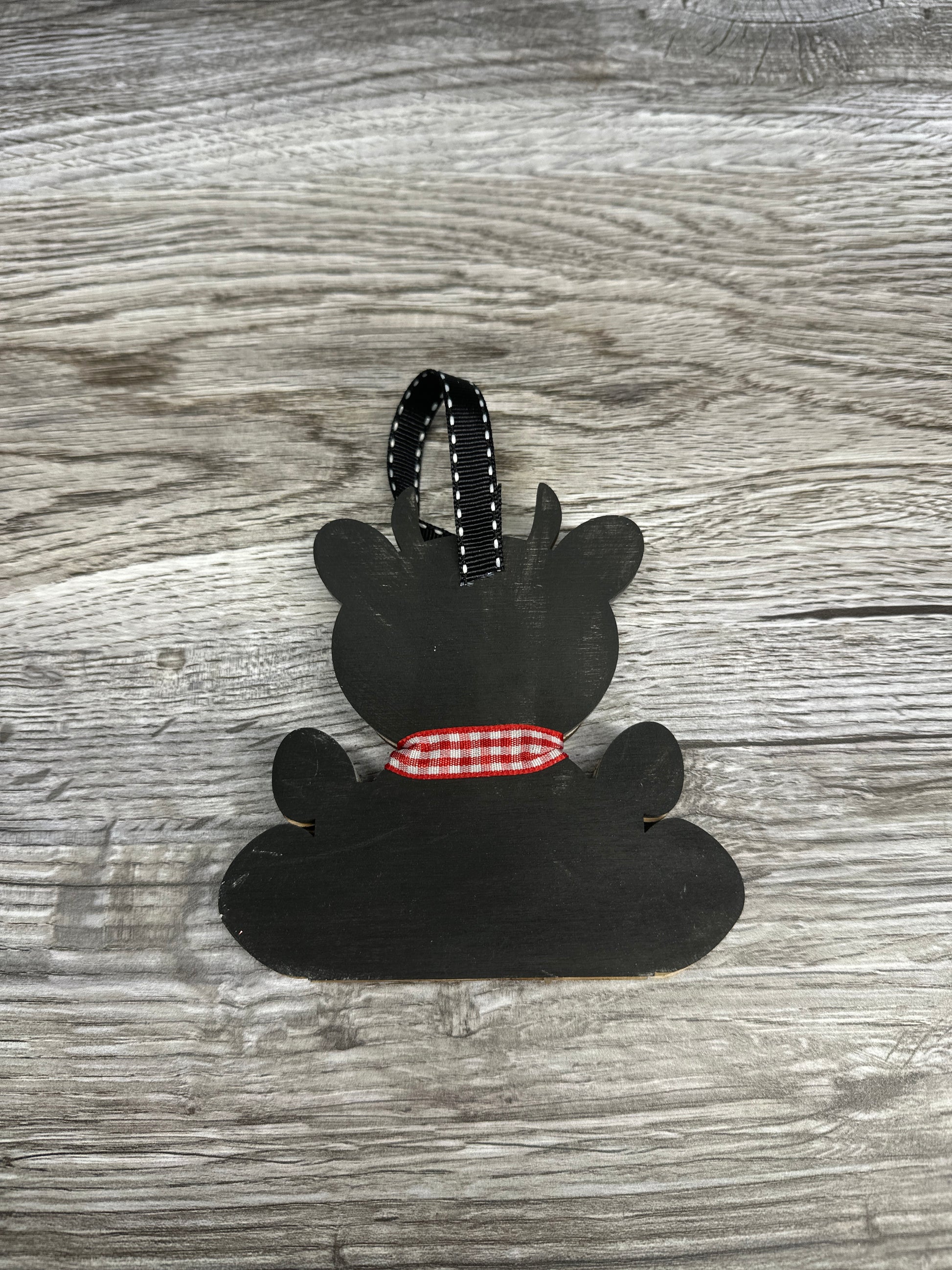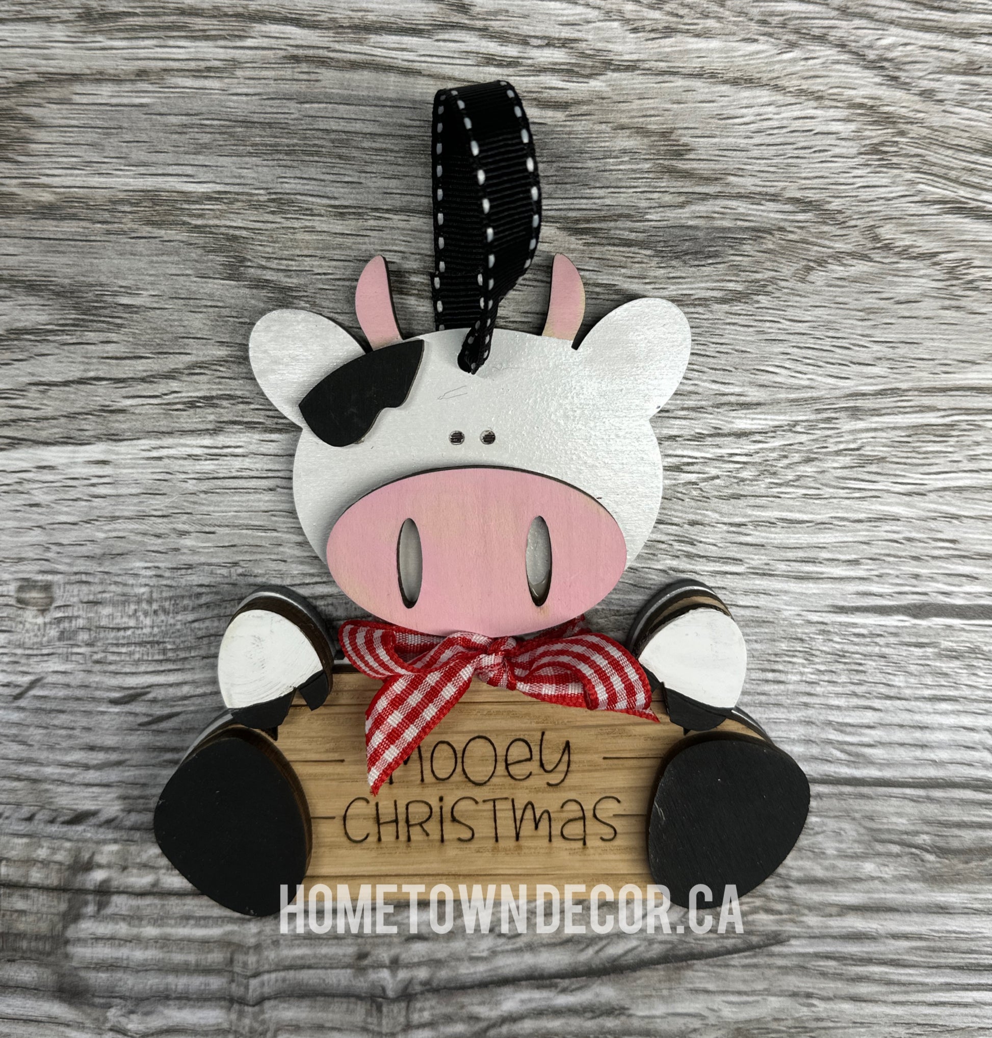 The whimsical cow is holding a sign saying "mooey Christmas" The ornament is completed with and a ribbon to attach to your Christmas tree or to hang perfectly year round.