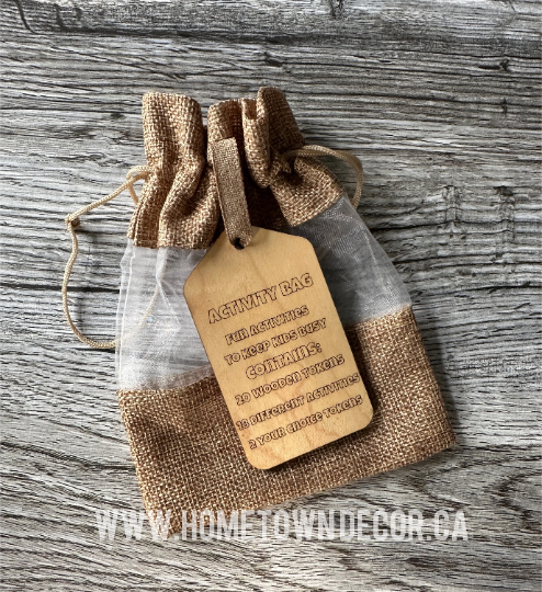 Activity Bag to keep kids busy. Contains 20 wooden tokens with 18 different activities and 2 your choice tokens. Comes with a bag to store the tokens in. Made from 1/4 inch Maple veneer. Makes for a great gift as well!