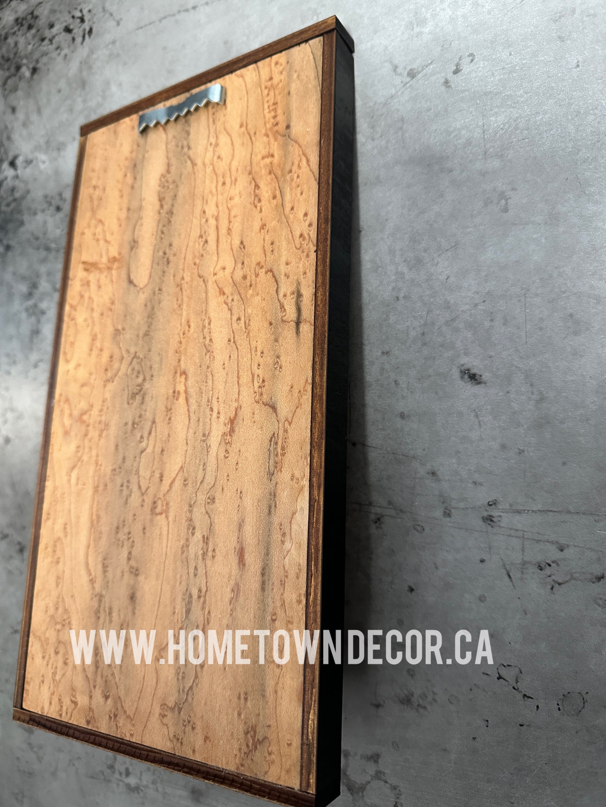 The sign is Natural Maple colored, with dark engraving and black lettering and trim.