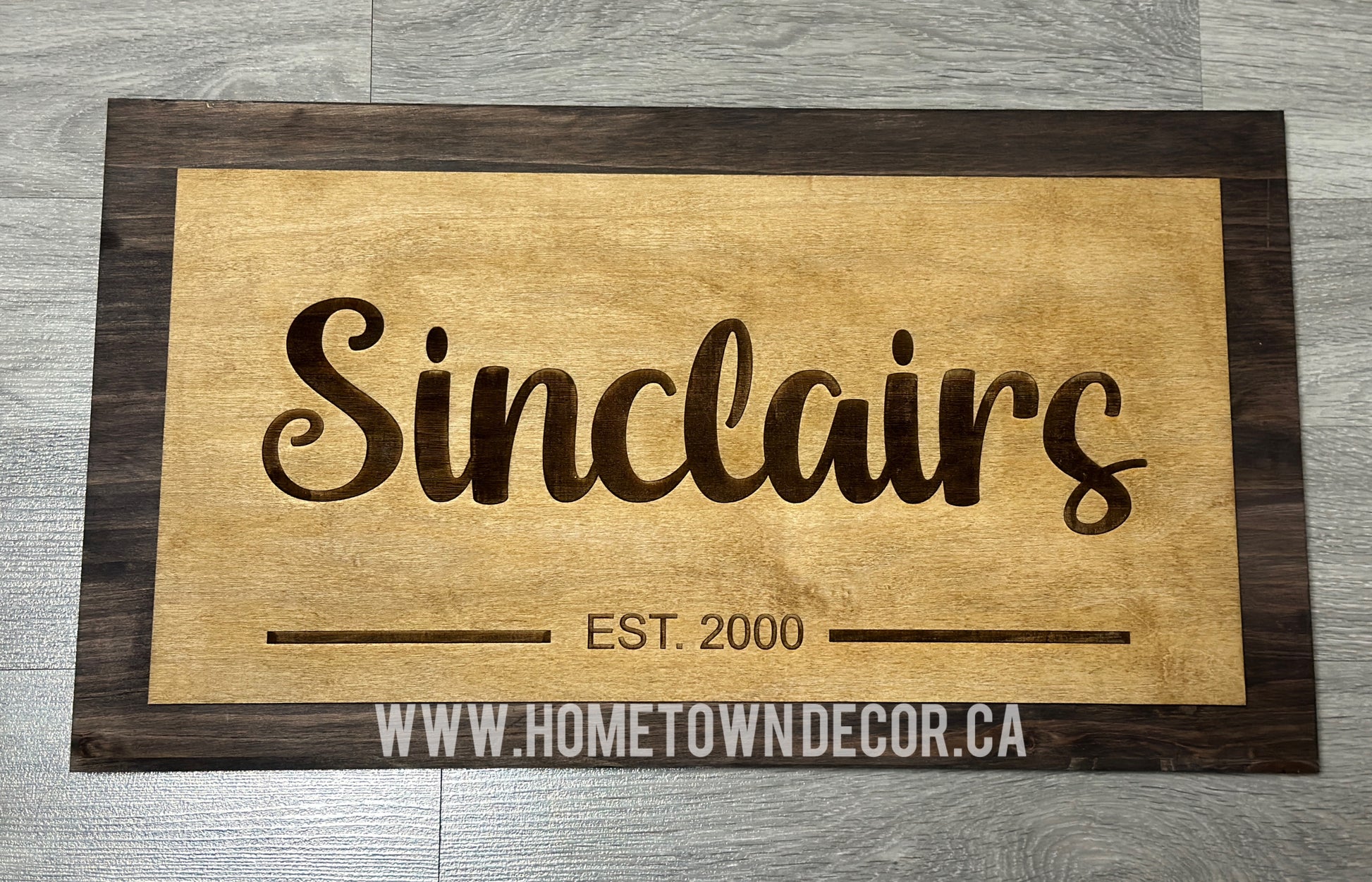 This is a sample of one of the custom name signs we make. The name and date are engraved on 1/4 Maple veneer and then mounted onto 1 inch thick pine board. This sample is 21 inches (53 cms) long and 11.5 inches (29 cms) tall in size. The starting price is $85 and may increase with any size or finishing changes. It is a custom order so please contact us before you order.