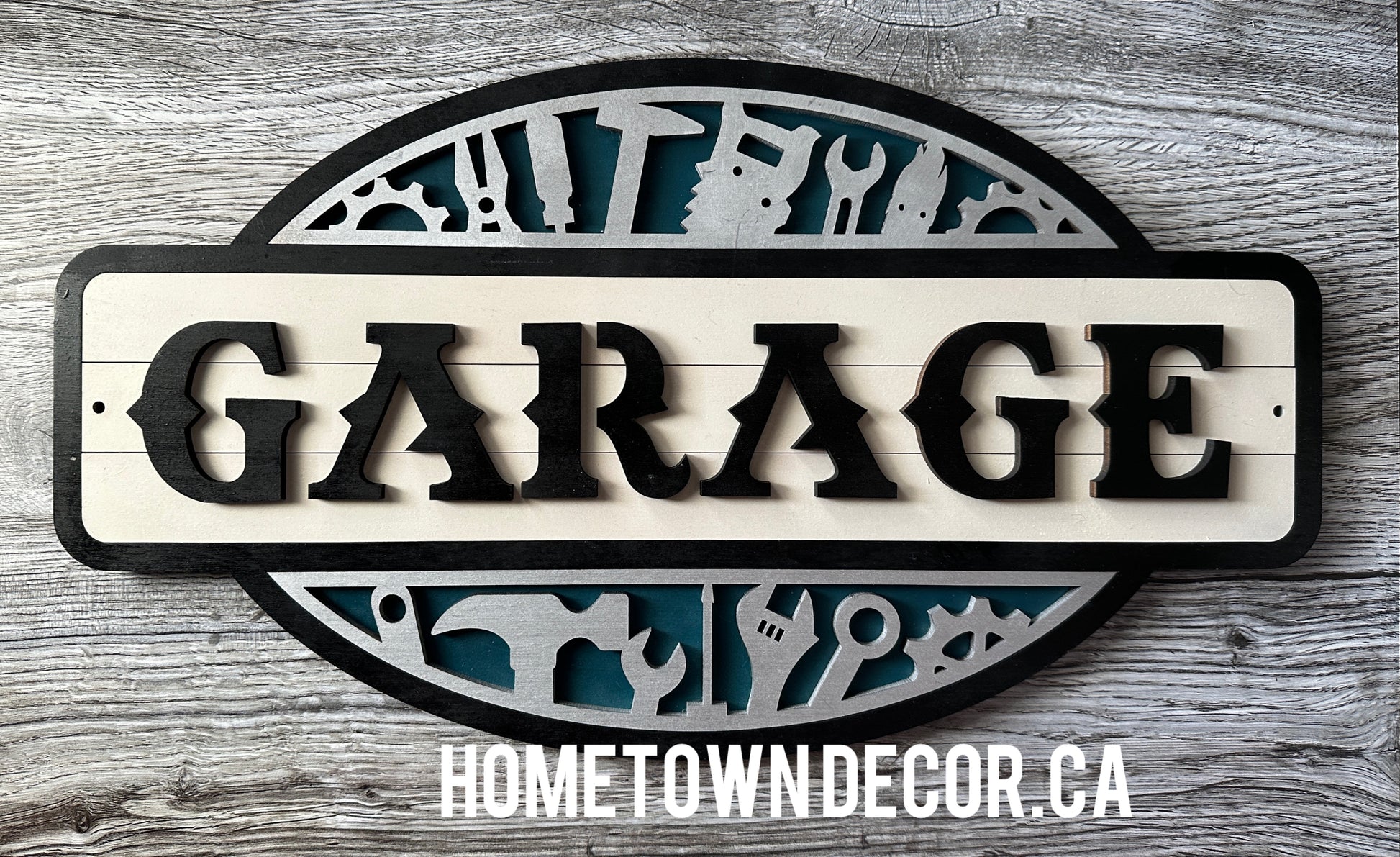 Garage/ workshop hanging sign. It is made from maple veneer and is painted ready to be hung. The overall size is 11.75 inches wide and 16 inches high.