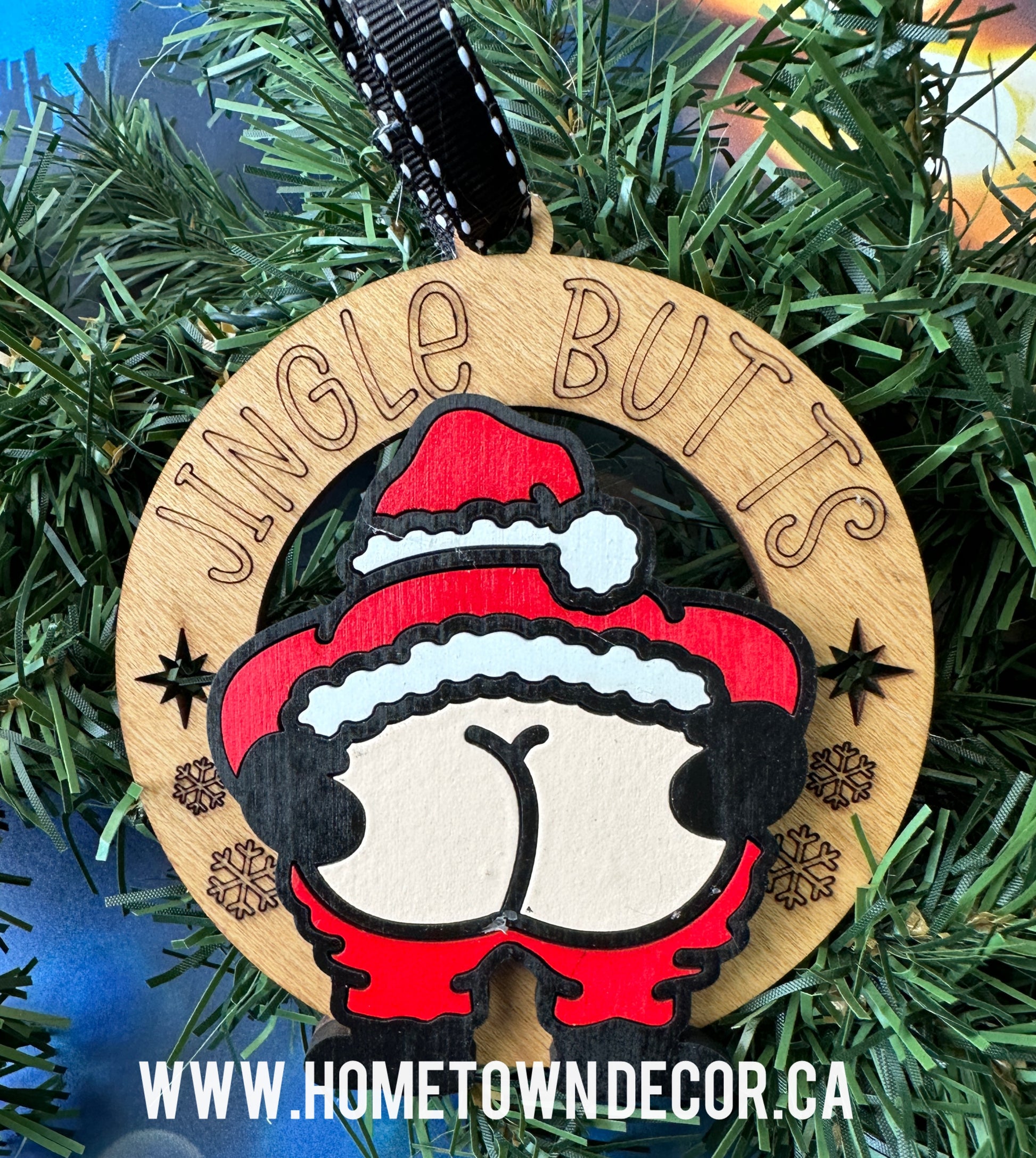 For those who aren't jolly all the time. Santa, a Snowman and a Reindeer are jingling their butts. This multiple layered wooden decoration is made from Maple veneer and is approximately 4 inches round. The ornament is completed with a either Santa, Snowman or Reindeer and a string to attach to your Christmas tree or to hang perfectly year round.