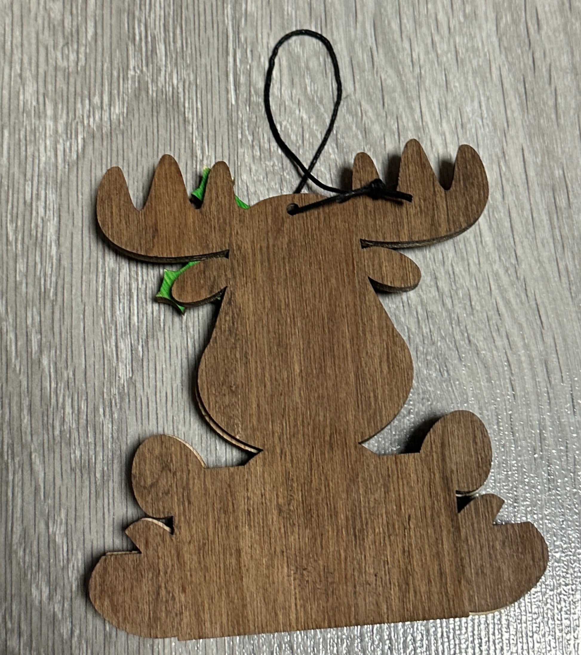 Wooden Moose Christmas Tree Ornament or home decoration. This adorable wooden decoration is made from 1/4 inch Maple and oak veneer and is approximately 5 inches tall by 4 inches wide. It comes with a string to attach to your Christmas tree or to hang perfectly year round.