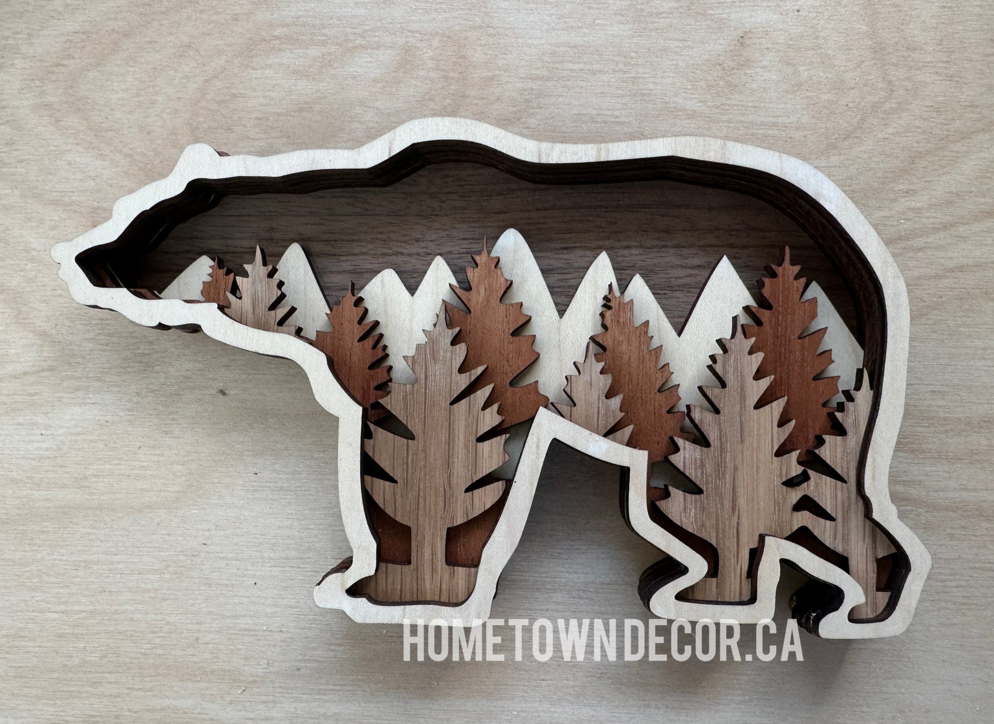 Natural looking 5 layered bear. We have two different styles in two different sizes in our most popular home decor item. Each bear is made from 5 pieces of veneer wood stacked onto of each other to give a 3D depth effect.