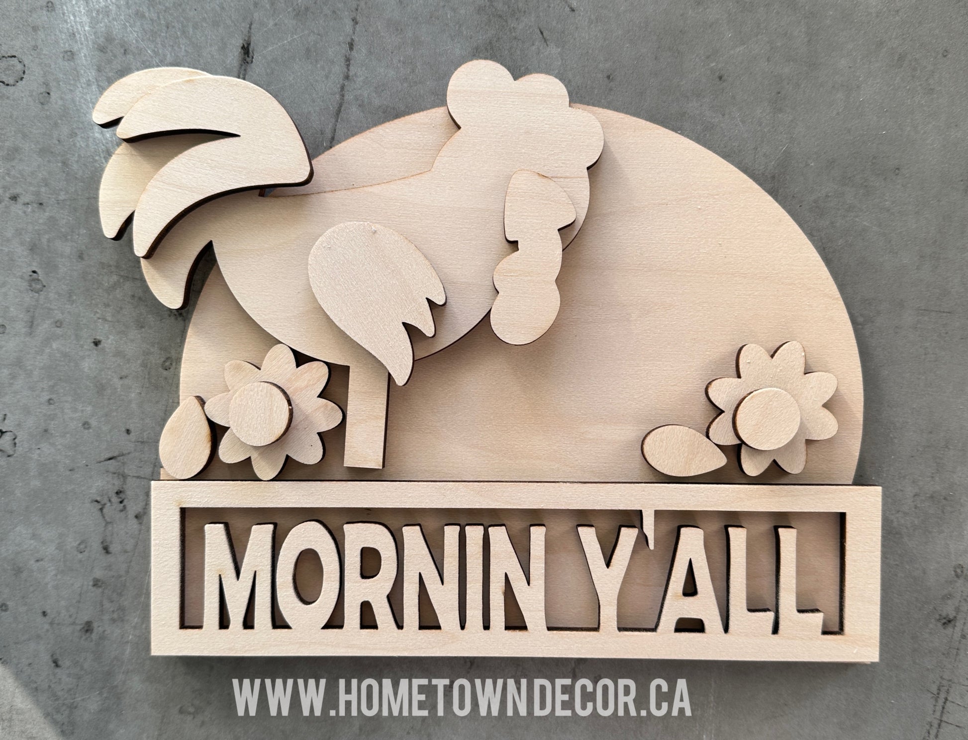 Mornin Y'all Rooster DIY sign Kit. Create your own Rooster sign. Kit comes with everything you need to create your own sign. Wood, cutouts, paint, brushes, glue, hanger, instructions are all included. Overall completed size is 8.5X6.5 inches / 21 X 17CM at the highest/widest points.