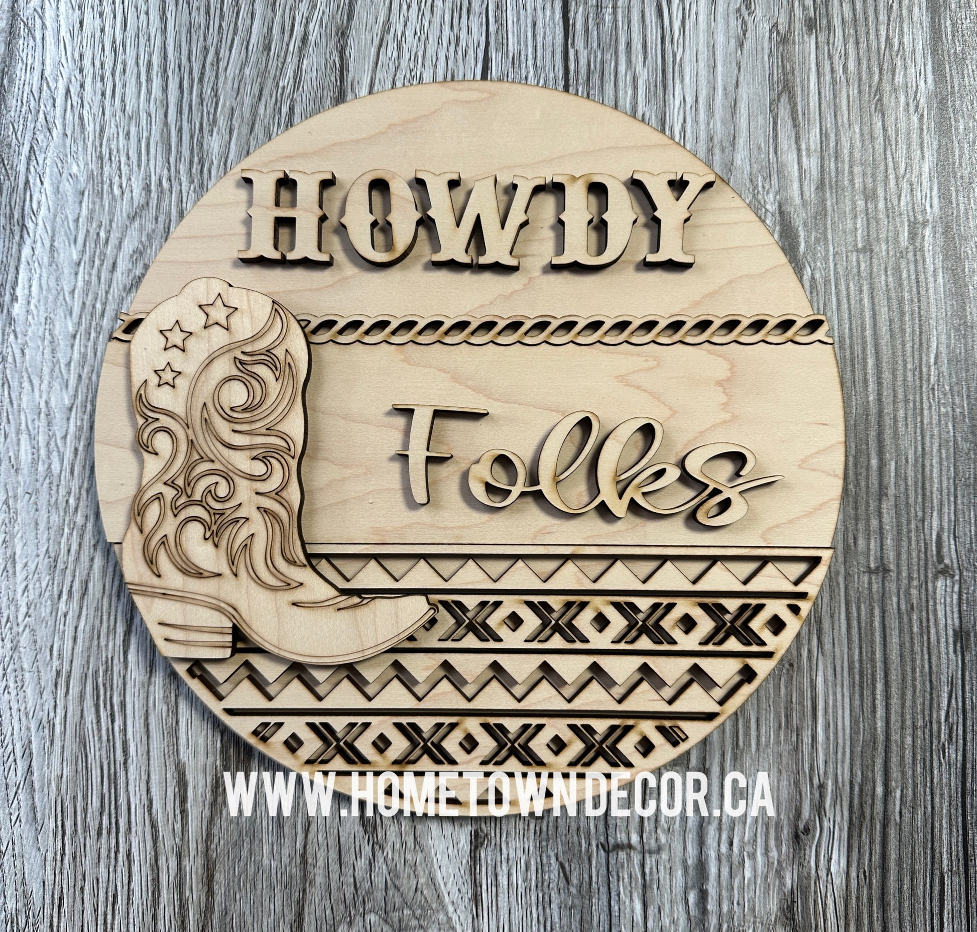 Howdy Folks Round sign Kit. Create your own Howdy Folks door hanger sign. Kit comes with everything you need to create your own sign. Wood, cutouts, paint, brushes, glue, hanger, instructions are all included. Overall completed size is 11.75 inches / 30 CM.