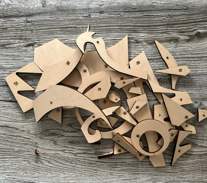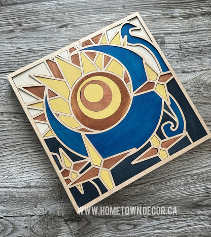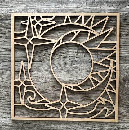 Sun and Stars DIY sign Kit. Create your own Sun and Star sign/wall hanging. Kit comes with everything you need to create your own sign. Wood, cutouts, paint, brushes, glue, hanger, instructions and color planner sheet are all included. This kit is of a medium level of expertise due to the many different pieces and their sizes. All the pieces and the backer piece are numbered to assist in building the sign.