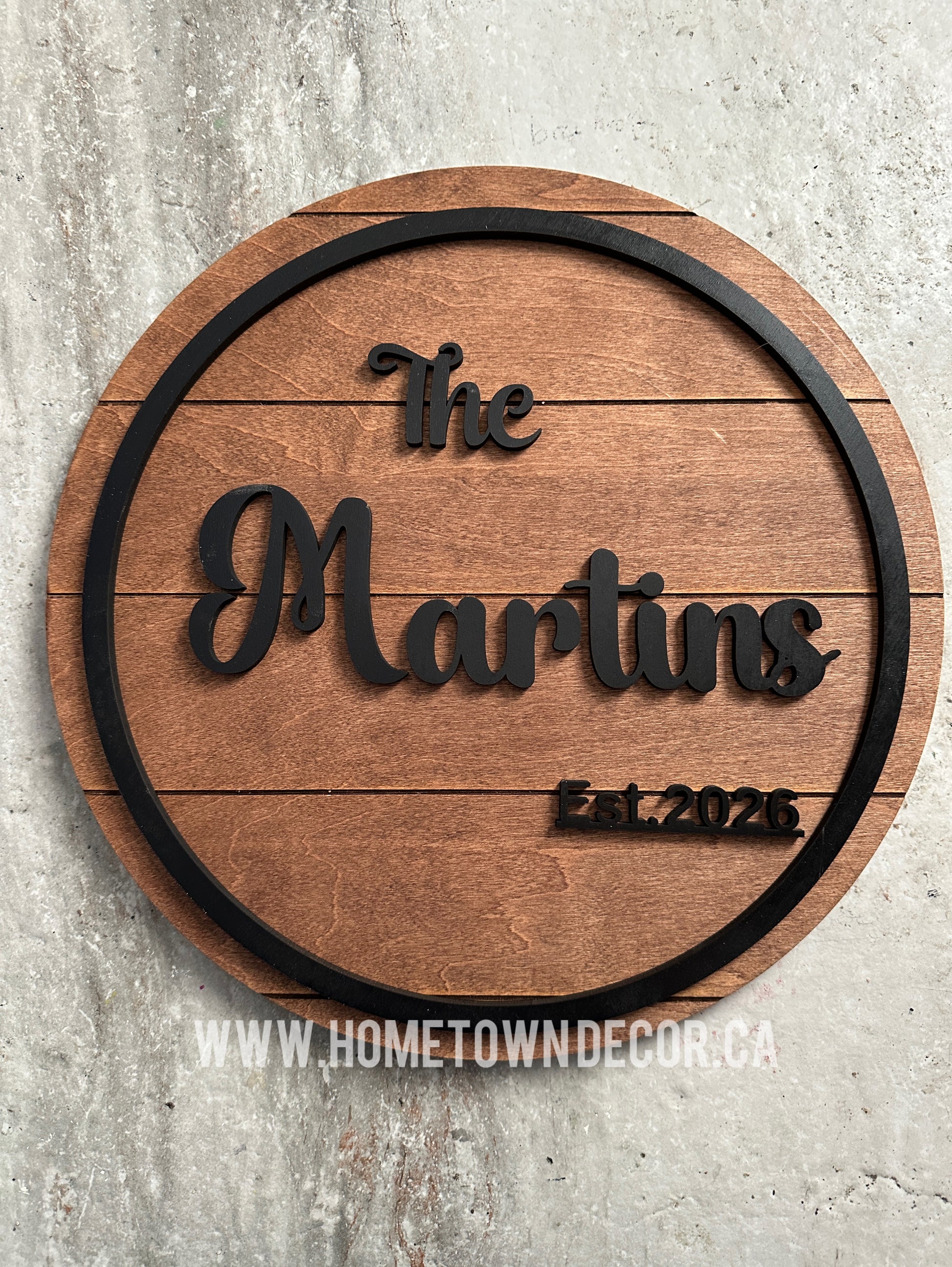 This is a sample of one of the custom name signs we make. The circle, name and date are cut, painted and then mounted onto 1/2 inch thick maple board. This sample is approximately 14 inches (26 cms) round. The starting price is $70 and may increase with any size or finishing changes. It is a custom order so please contact us before you order.