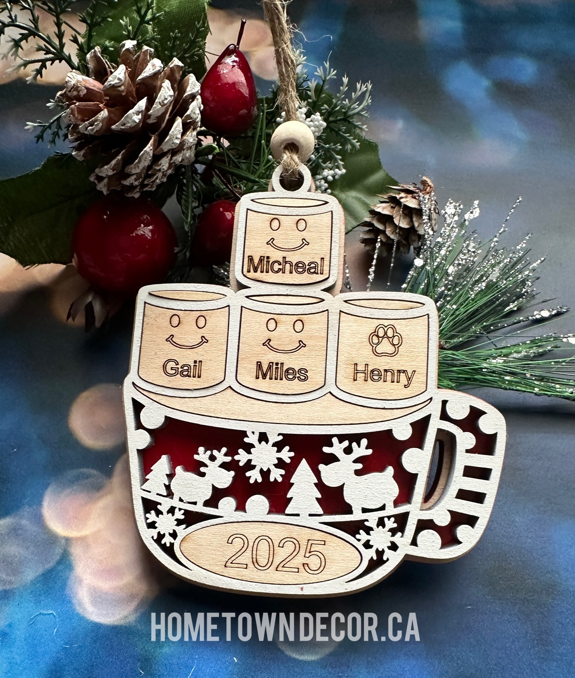 Personalized name marshmallows in a cup family ornament. What a great gift or keepsake! This is a custom made ornament where you pick how many names you would like (1-12) and we add them to the cup. The size depends on how many names you add. We can include your pets as well! It comes with a string to complete the look. Made from 1/4" maple veneer wood. Pictures are samples of different numbers of marshmallows added. You have the option of adding pet names. People will have the smiley face and pets with have the paw print.