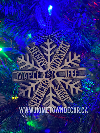 Personalized dated Family Snowflake ornament. What a great gift or keepsake! This is a two layered ornament with contrasting stain colors. It comes with a ribbon to complete the look.