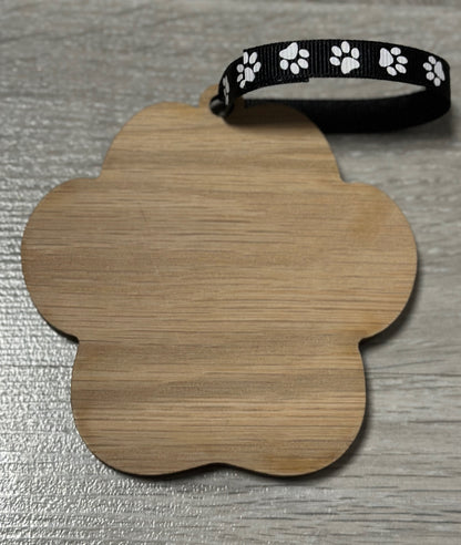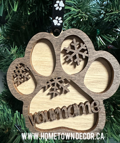 Personalized pet paw ornament. Have your pet's name added to an ornament to hang on your tree or all year round. Made from 1/4 inch Maple veneer and white oak. Overall size is approximately 4 inches.