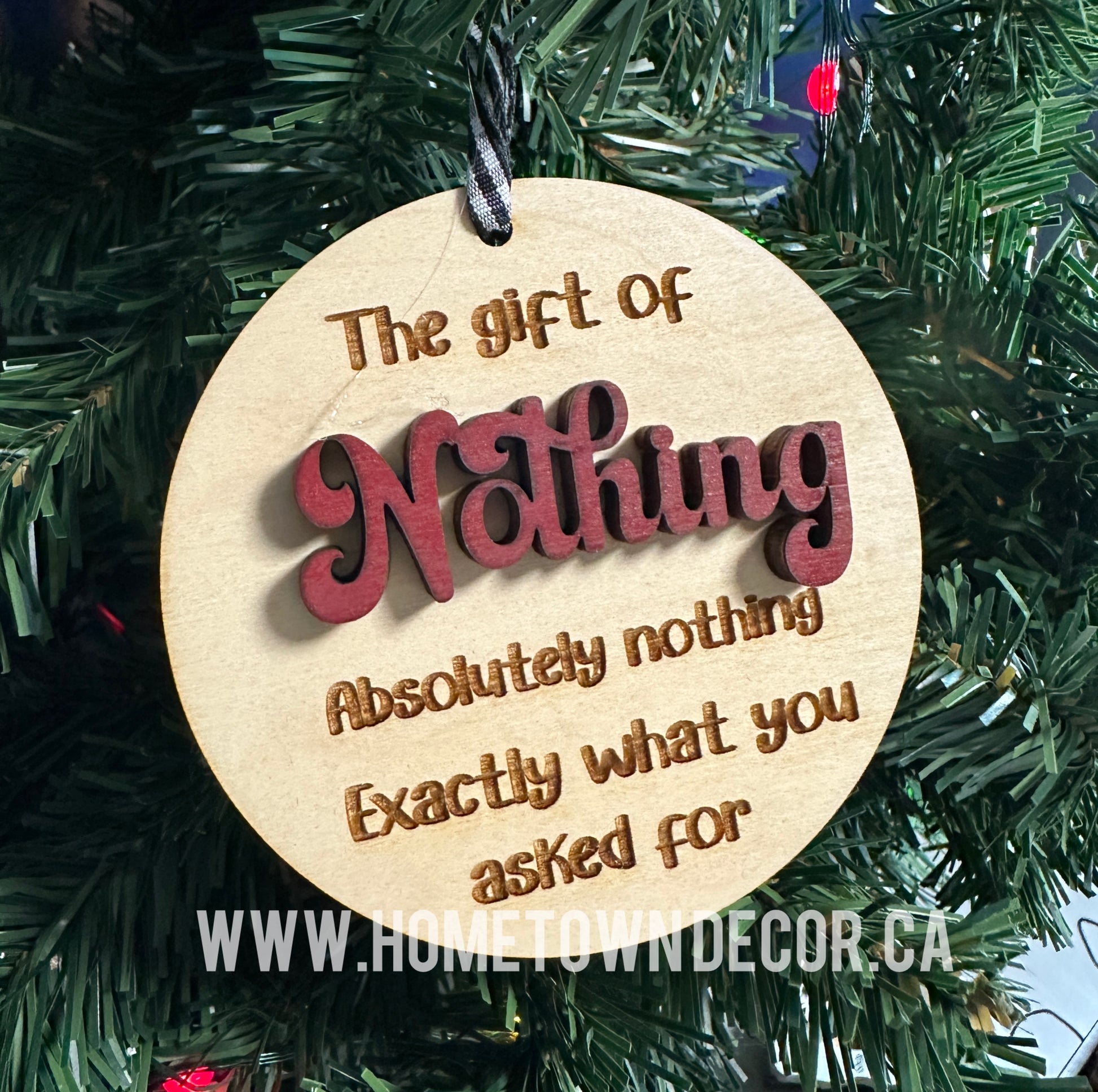 This hilarious the gift of nothing tree Ornament or home decoration is perfect as a gift. This multiple layered wooden decoration is made from Maple veneer and is approximately 3.5 inches round. It is natural Maple color with the saying "The gift of Nothing absolutely nothing Exactly what you asked for". It is completed with the "nothing" 3D in read and a ribbon to attach to your Christmas tree or to hang perfectly year round.